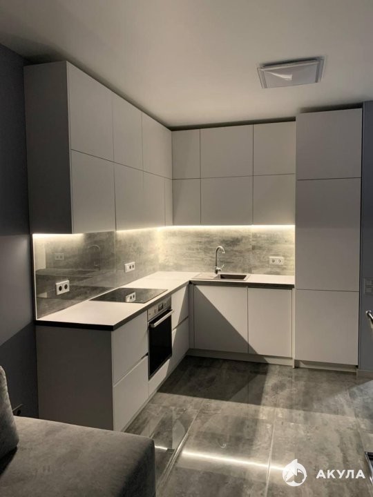 Полностью оборудованная кухня: холодильник, плита с 4 конфорками, духовка, микроволновка, электрический чайник, небольшой набор посуды.