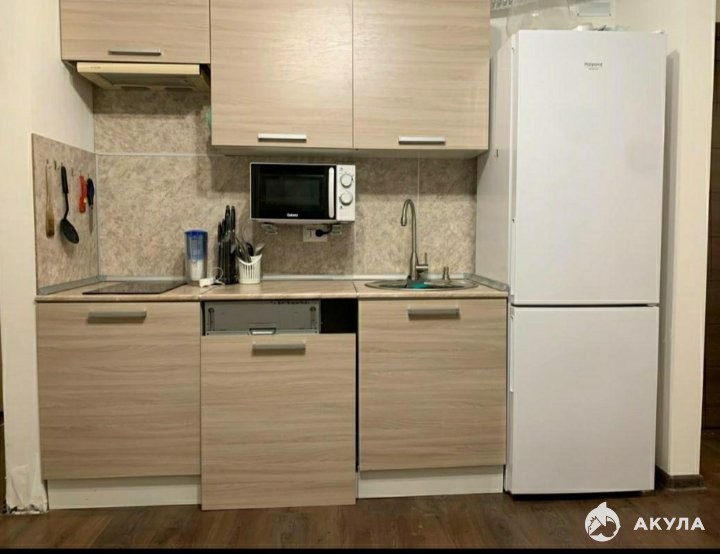 Полностью оборудованная кухня: холодильник, плита с 4 конфорками, духовка, микроволновка, электрический чайник, небольшой набор посуды.