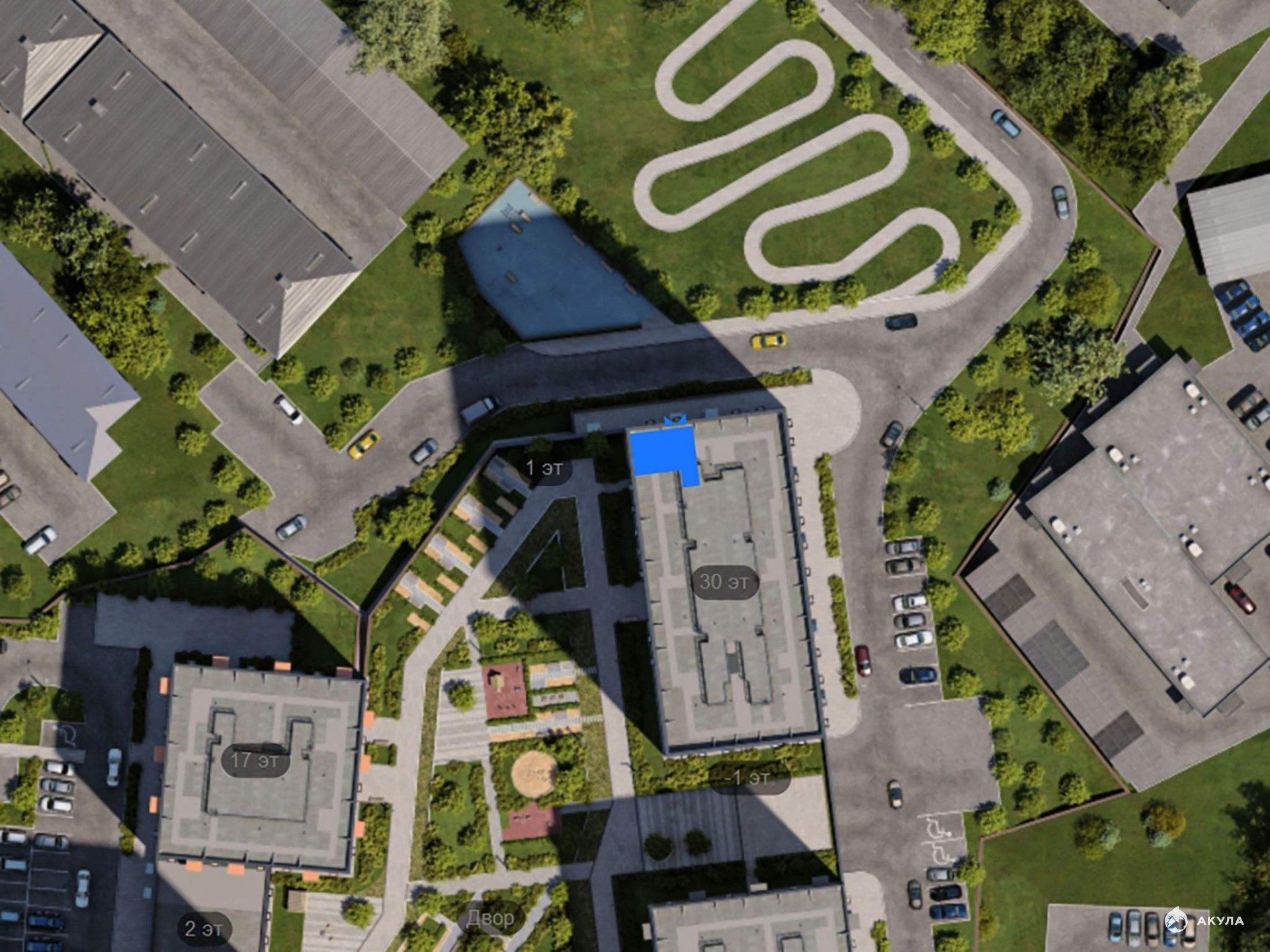 В проекте всего четыре дома и подземный паркинг, в который можно будет спуститься на лифте. Высота домов от 17 до 30 этажей - благодаря переменной этажности солнце будет лучше освещать двор и квартиры.
