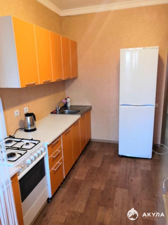 Полностью оборудованная кухня: холодильник, плита с 4 конфорками, духовка, микроволновка, электрический чайник, небольшой набор посуды.