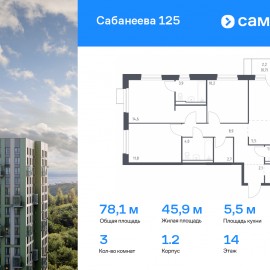 Строим кварталы для жизни с заботой о будущем. Предлагается 3-комнатная квартира комфорт-класса 78, 1 кв.м в корпусе 1.2 на 14 этаже, в ЖК «Сабанеева 125» Квартира без отделки. Доступность опции «отделка» и возможность комплектации мебелью и декором уточняйте у...