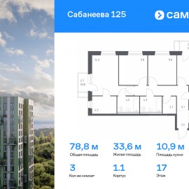 Строим кварталы для жизни с заботой о будущем. Предлагается 3-комнатная квартира комфорт-класса 78, 8 кв.м в корпусе 1.1 на 17 этаже, в ЖК «Сабанеева 125» Квартира без отделки. Доступность опции «отделка» и возможность комплектации мебелью и декором уточняйте у...