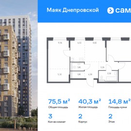 Строим кварталы для жизни с заботой о будущем. Предлагается 3-комнатная квартира комфорт-класса 75, 49 кв.м в корпусе 2 на 2 этаже, в ЖК «Маяк Днепровской» Квартира без отделки. Доступность опции «отделка» и возможность комплектации мебелью и декором уточняйте у...