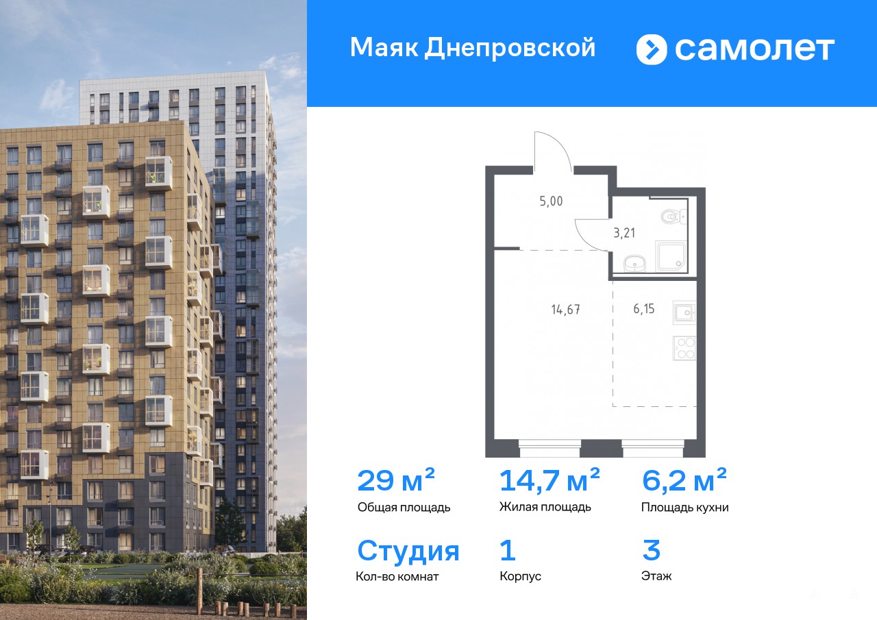 Строим кварталы для жизни с заботой о будущем. Предлагается квартира студия комфорт-класса 29, 03 кв.м в корпусе 1 на 3 этаже, в ЖК «Маяк Днепровской»