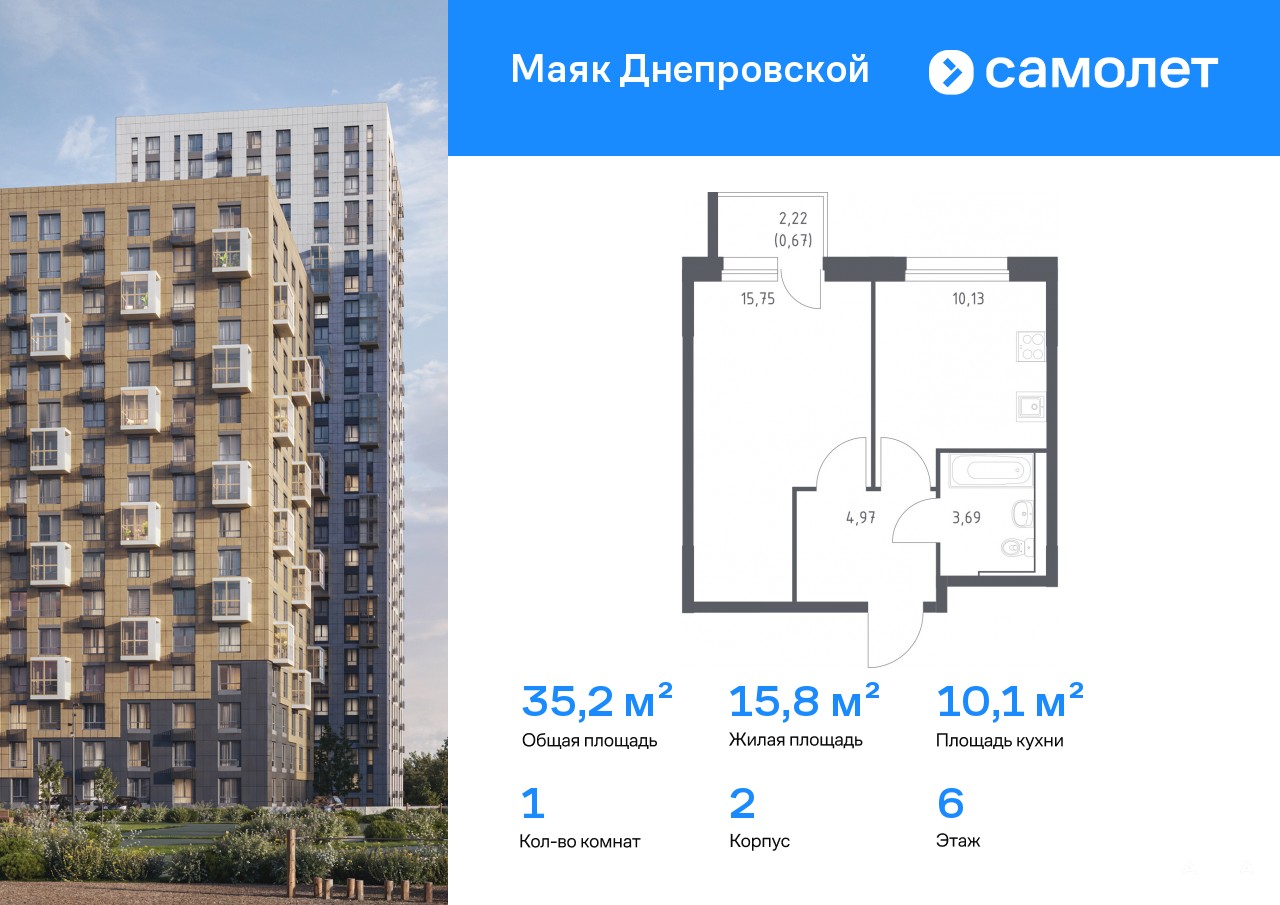 Строим кварталы для жизни с заботой о будущем. Предлагается 1-комнатная квартира комфорт-класса 35, 21 кв.м в корпусе 2 на 6 этаже, в ЖК «Маяк Днепровской»