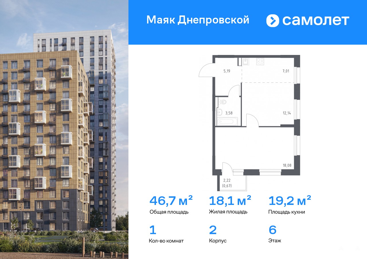 Строим кварталы для жизни с заботой о будущем. Предлагается 1-комнатная квартира комфорт-класса 46, 67 кв.м в корпусе 2 на 6 этаже, в ЖК «Маяк Днепровской»