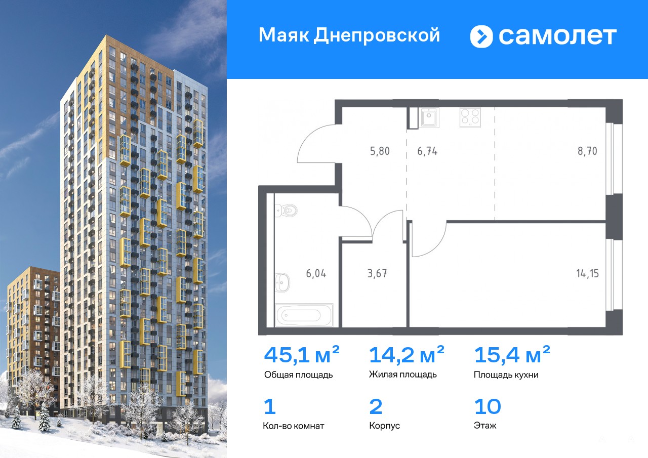 Строим кварталы для жизни с заботой о будущем. Предлагается 1-комнатная квартира комфорт-класса 45, 1 кв.м в корпусе 2 на 10 этаже, в ЖК «Маяк Днепровской»