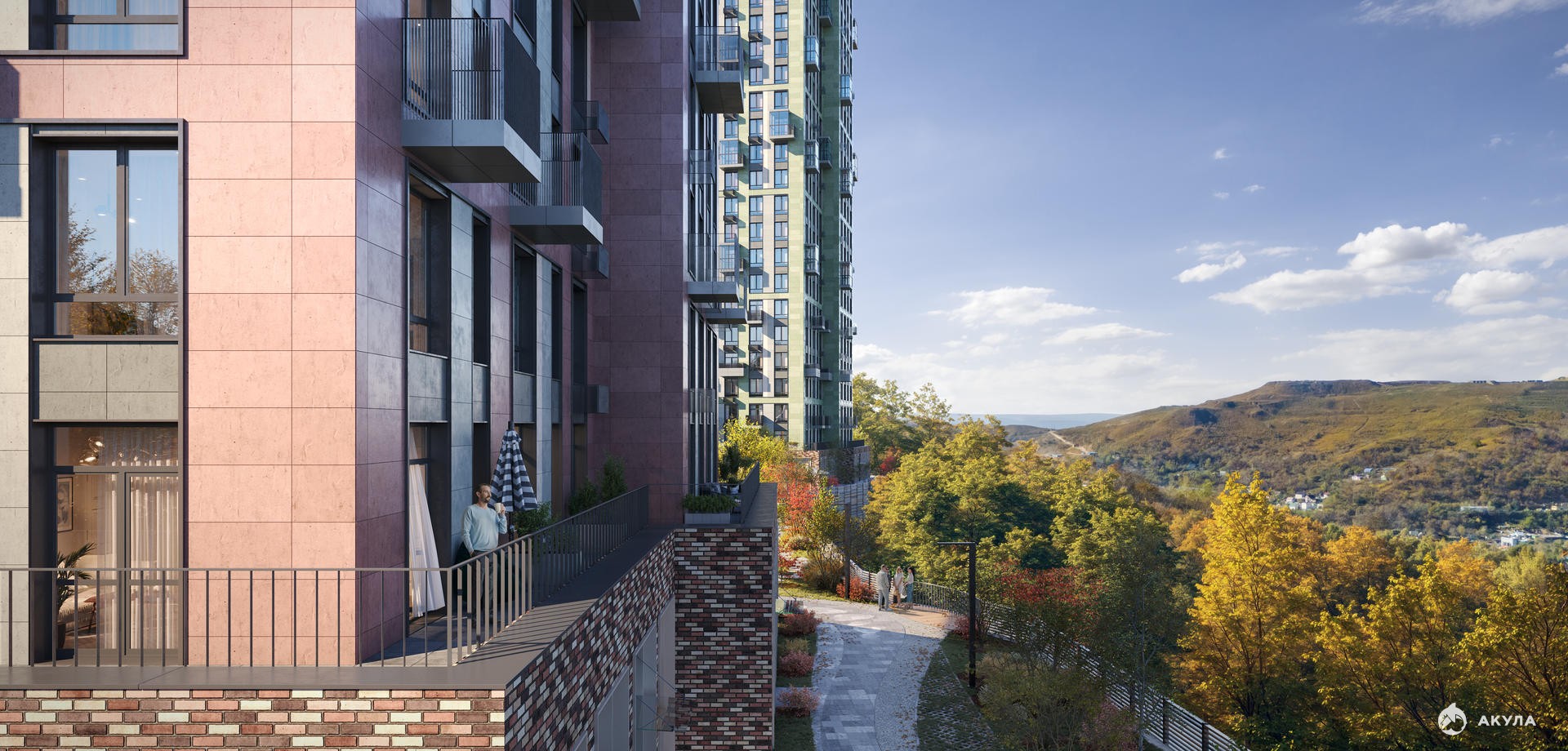 Дворы оформлены как сад с дальневосточной флорой, есть смотровые площадки, скалодром, перголы и игровые зоны для детей. Подземный паркинг — трехуровневый.
