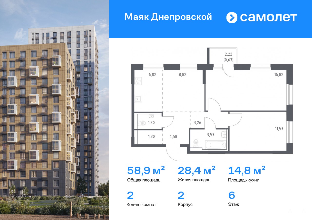 Строим кварталы для жизни с заботой о будущем. Предлагается 2-комнатная квартира комфорт-класса 58, 87 кв.м в корпусе 2 на 6 этаже, в ЖК «Маяк Днепровской»