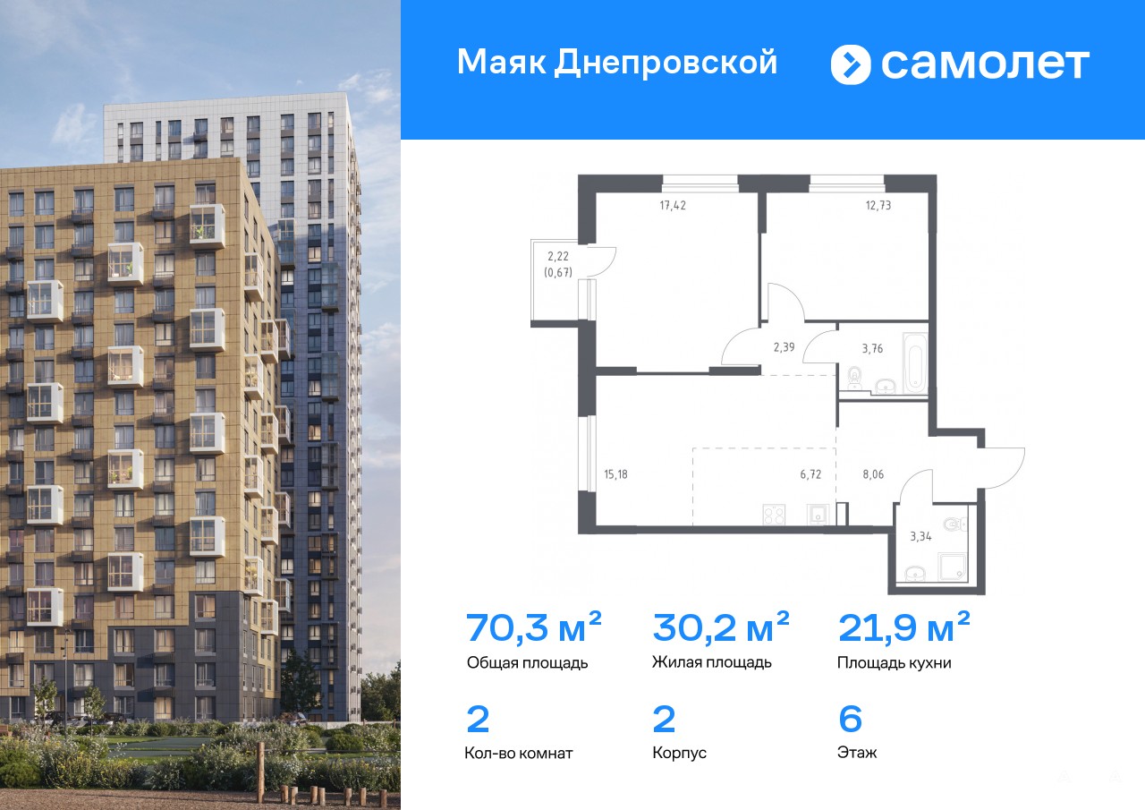 Строим кварталы для жизни с заботой о будущем. Предлагается 2-комнатная квартира комфорт-класса 70, 27 кв.м в корпусе 2 на 6 этаже, в ЖК «Маяк Днепровской»