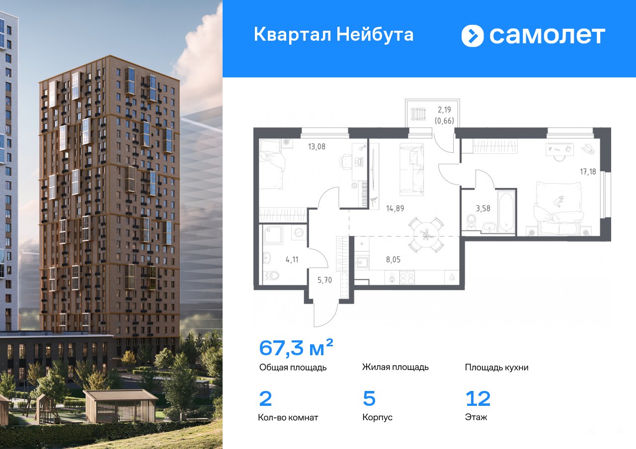Строим кварталы для жизни с заботой о будущем. Предлагается 2-комнатная квартира комфорт-класса 67, 25 кв.м в корпусе 5 на 12 этаже, в ЖК «Квартал Нейбута»