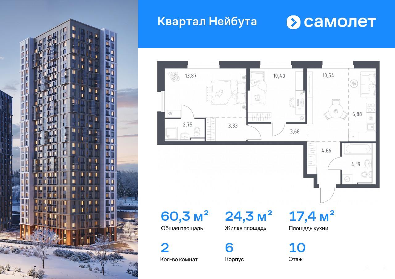 Строим кварталы для жизни с заботой о будущем. Предлагается 2-комнатная квартира комфорт-класса 60, 3 кв.м в корпусе 6 на 10 этаже, в ЖК «Квартал Нейбута»