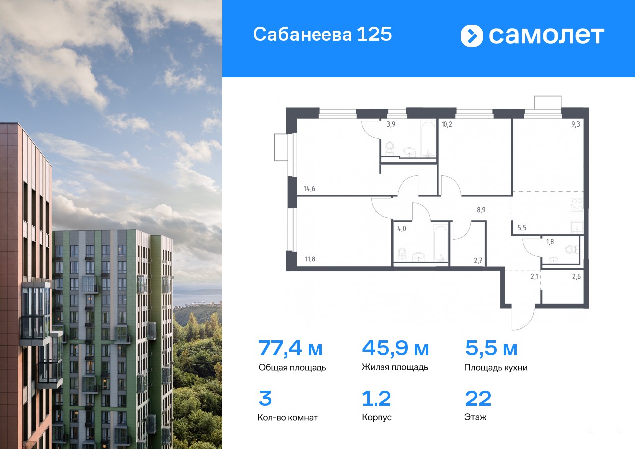 Строим кварталы для жизни с заботой о будущем. Предлагается 3-комнатная квартира комфорт-класса 77, 4 кв.м в корпусе 1.2 на 22 этаже, в ЖК «Сабанеева 125»
