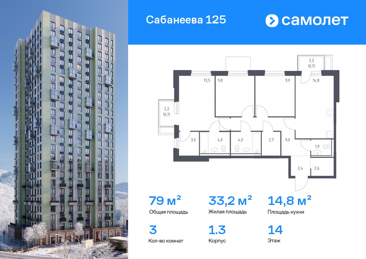 Строим кварталы для жизни с заботой о будущем. Предлагается 3-комнатная квартира комфорт-класса 79 кв.м в корпусе 1.3 на 14 этаже, в ЖК «Сабанеева 125»