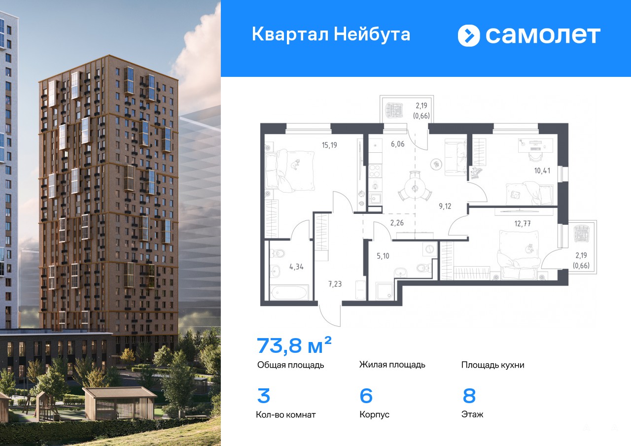Строим кварталы для жизни с заботой о будущем. Предлагается 3-комнатная квартира комфорт-класса 73, 8 кв.м в корпусе 6 на 8 этаже, в ЖК «Квартал Нейбута»