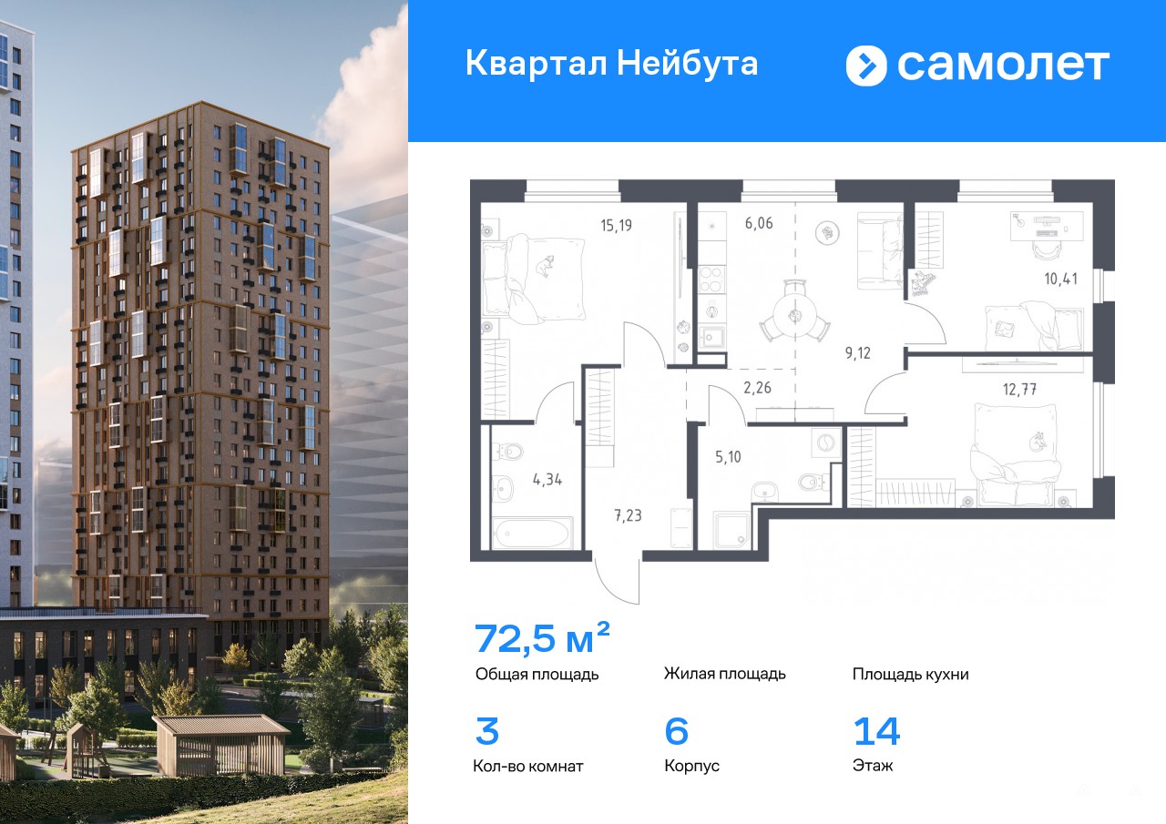 Строим кварталы для жизни с заботой о будущем. Предлагается 3-комнатная квартира комфорт-класса 72, 48 кв.м в корпусе 6 на 14 этаже, в ЖК «Квартал Нейбута»