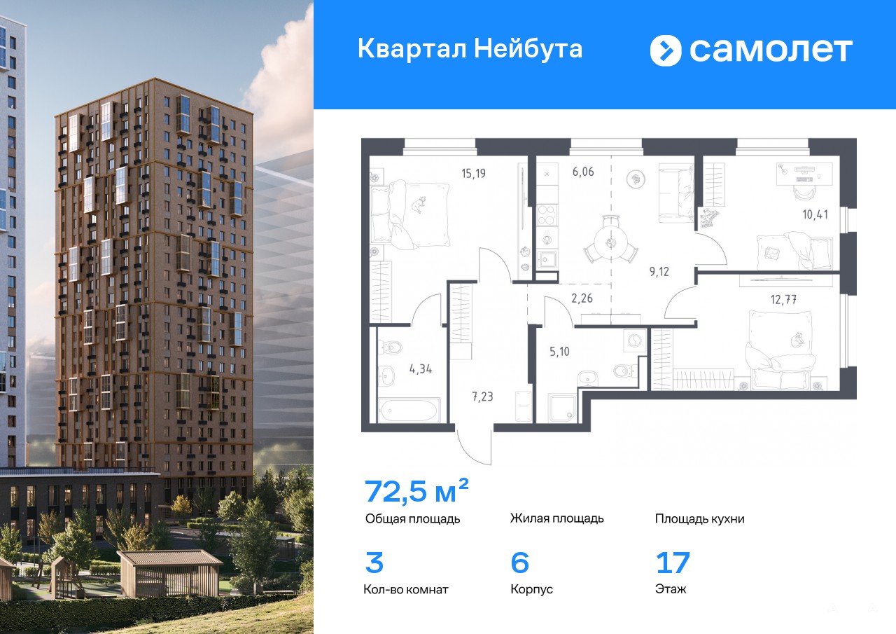 Строим кварталы для жизни с заботой о будущем. Предлагается 3-комнатная квартира комфорт-класса 72, 48 кв.м в корпусе 6 на 17 этаже, в ЖК «Квартал Нейбута»