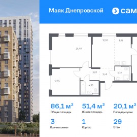 Строим кварталы для жизни с заботой о будущем. Предлагается 3-комнатная квартира комфорт-класса 86, 09 кв.м в корпусе 1 на 29 этаже, в ЖК «Маяк Днепровской» Квартира без отделки. Доступность опции «отделка» и возможность комплектации мебелью и декором уточняйте у...