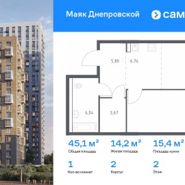 Строим кварталы для жизни с заботой о будущем. Предлагается 1-комнатная квартира комфорт-класса 45, 1 кв.м в корпусе 2 на 2 этаже, в ЖК «Маяк Днепровской» Квартира без отделки. Доступность опции «отделка» и возможность комплектации мебелью и декором уточняйте у...