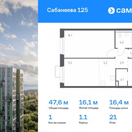 Строим кварталы для жизни с заботой о будущем. Предлагается 1-комнатная квартира комфорт-класса 47, 6 кв.м в корпусе 1.1 на 21 этаже, в ЖК «Сабанеева 125» Квартира без отделки. Доступность опции «отделка» и возможность комплектации мебелью и декором уточняйте у...